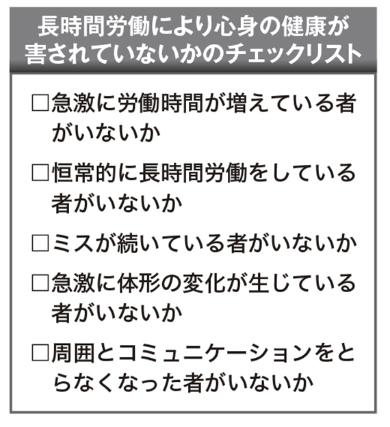長時間労働に伴う従業員の心身の不調に、会社がいち早く気づき、対応することも重要です。健康診断で異常の所見があった者については、従業員まかせにするのではなく、会社として医師の意見に基づいた適切な事後措置を講じます。