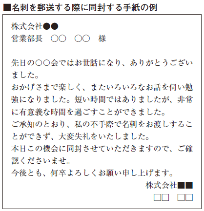急がない場合で、相手が自分の会社の近くであれば、後日、訪問して名刺を届けます。その場合、アポイントメントは不要です。本人が留守でも受付に出てきた人に、事情を話して渡します。相手の方が遠隔地の場合は3日以内に郵送します。