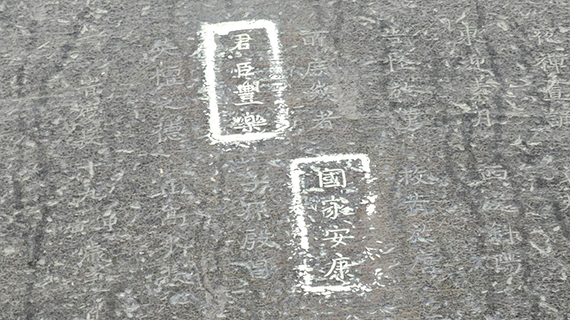肉眼ではわかりづらいが、「国家安康」「君臣豊楽」という2句の部分が、わかりやすいように白く囲まれている。また、鐘の内側にある白いシミは、大坂の陣で自害した淀殿の怨念が顔の模様となって浮かび上がっているのだという。