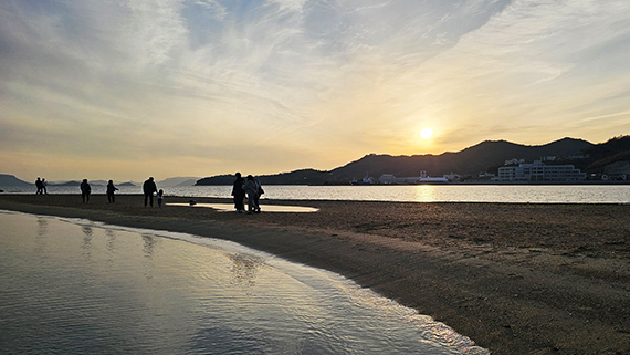 小豆島、豊島、直島と瀬戸内の島を巡って来た。新幹線の岡山駅からバスで新岡山港に出、フェリーで小豆島へ。海とは思えないベタ凪のなか1時間ほどで小豆島の玄関口土庄港に入る。小豆島に来るのは小学校の修学旅行以来52年振りで、今人気のエンジェルロードの真ん前のホテルに泊まった。ここだと部屋の窓からトンボロの様子をみることができる。
