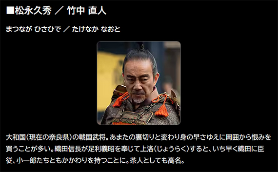 長慶の没後は三好三人衆とともに将軍足利義輝を弑して事実上畿内の実権を握ると、今度は三好三人衆と対立、東大寺大仏殿を焼いている。そしてその翌年には入京した織田信長に従った様子が「豊臣兄弟!」で描かれていた。久秀は信長から大和一国を安堵されたものの、結局信長に叛き、子久通とともに自刃して滅亡した。