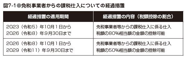 インボイス制度が施行されると、免税事業者からの仕入について税額控除の制限を受けるため、前述したように、取引から排除されるのではないかといった問題が生じる可能性があるのですが、こうした問題を緩和するため、図7-1のような経過措置が設けられています。